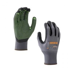 Rękawice NEO PLUS wykonane z dzianiny nylonowo poliestrowej z dodatkiem lycry, powlekane w części chwytnej spienionym nitrylem w kolorze czarnym oraz dodatkowym nakropieniem w kolorze zielonym.