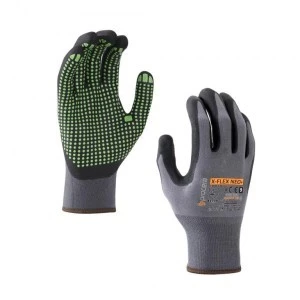 Rękawice NEO PLUS wykonane z dzianiny nylonowo poliestrowej z dodatkiem lycry, powlekane w części chwytnej spienionym nitrylem w kolorze czarnym oraz dodatkowym nakropieniem w kolorze zielonym.