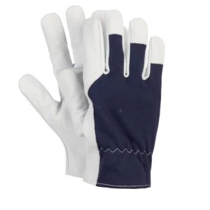 ✅ Rękawice wykonane w części chwytnej z jednego kawałka licowej skóry koziej , wierzch wykonany z elastycznej tkaniny bawełnianej w granatowym kolorze.