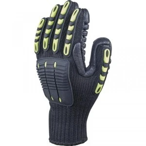 rekawice z poliestru i bawełny, dłoń i końce palców z poduszeczkami z kauczuku chloroprenowego, wzmocnienia z neoprenu Strona chwytna z poliuretanu i poliamidu. Podwójna grubość: żel i pianka. Mankiet z neoprenu, kolor żółto-czarny rozmiar 10, zarkes rozmiarów: 10, 11