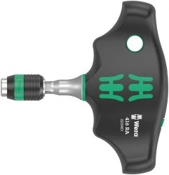 Drobnozębny mechanizm zapadkowy w rękojeści (80 zębów/kąt powrotu zapadki 4,5°) umożliwia łatwiejsze i szybsze wkręcanie bez konieczności ponownego nasadzania narzędzia. Całkowicie wbudowany w rękojeść mechanizm zapadkowy zapewnia bardzo łatwą i wygodną pracę. Dźwignia przełączająca umożliwiająca wygodną zmianę kierunku pracy prawo/lewo jedną ręką. Ergonomicznie ukształtowana rękojeść wypełnia całą dłoń, a miękkie, zaokrąglone zagłębienia stanowią wsparcie dla palców. Kontakt całej powierzchni dłoni z rękojeścią eliminuje straty tarcia pomiędzy dłonią a rękojeścią. Uchwyt do bitów z chwytem sześciokątnym 1/4" wg DIN ISO 1173-C 6,3 oraz E 6,3. Z technologią Rapidaptor do szybkiej wymiany bitów.