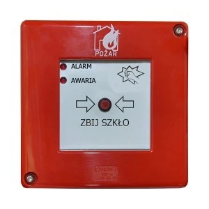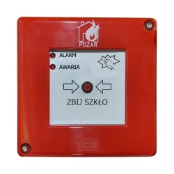 Ręczny ostrzegacz pożarowy ROP bez młoteczka, z sygnalizacją 2-diodową, czerwoną migającą i czerwoną świecącą stale, styki XY. Opis drugiej diody (AWARIA).