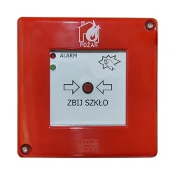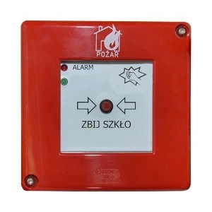 Ręczny ostrzegacz pożarowy ROP bez młoteczka, z sygnalizacją 2-diodową, czerwoną migającą i zieloną, styki XY. Druga dioda bez opisu.