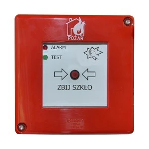 Ręczny ostrzegacz pożarowy ROP bez młoteczka, z sygnalizacją 2-diodową, czerwoną migającą i zieloną, styki XY. Opis drugiej diody (TEST).