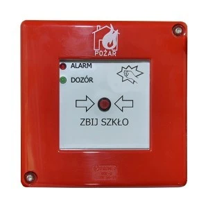 Ręczny ostrzegacz pożarowy ROP bez młoteczka, z sygnalizacją 2-diodową, czerwoną migającą i zieloną, styki XY. Opis drugiej diody (DOZÓR).