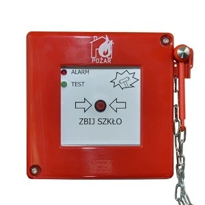 Ręczny ostrzegacz pożarowy ROP z młoteczkiem, z sygnalizacją 2-diodową, czerwoną migającą i zieloną, styki XY. Opis drugiej diody (TEST).