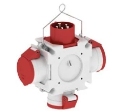 Rozdzielacz krzyżowy stopień ochrony: IP 44 wysokojakościowe tworzywo-obudowa z wieszakiem wymiary: 100 x 100 mm / wys. x szer. (wymiar bez zabudowanych elementów) wyposażenie ---------- 3 x CEE-gniazdo 16A 400V 5p 6h IP 44 (132001) zasilanie ------