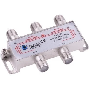 Metalowy rozdzielacz antenowy TV-SAT z 1 wejściem i 4 wyjściami typu F umożliwia podłączenie sygnału z anteny DVB-T lub satelitarnej do trzech telewizorów, zapewniając stabilne i wysokiej jakości przesyłanie sygnału.