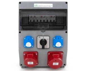 Rozdzielnia budowlana 32A/4 + 16A/4 + 2*GS 230V + zabezpieczenia + wyłącznik L‑0‑P, 12NO22C11C11CLP