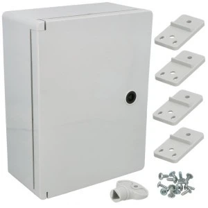 Obudowy ma kolor jasno szary – RAL 7035 – jest wykonana z materiału ABS, posiada drzwi na zawiasach zamykanych za pomocą zamka, wyposażona jest w płytę montażową o grubości 1,20mm oraz zestaw zaczepów do montowania natynkowego.