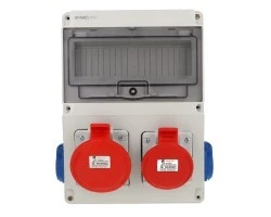 Rozdzielnica SB-103505-S0060-54 przeznaczona do rozdziału energii elektrycznej w instalacjach tymczasowych i stacjonarnych; wyposażona w zestaw gniazd 5×32A, 5×16A oraz 2×3×16A. Model ma nominalny prąd wejściowy INA = 32 A i stopień ochrony IP54.