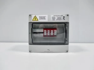 Rozdzielnica z ochroną przepięciową T2 oraz zabezpieczeniami nadprądowymi do stosowania wewnątrz pomieszczeń.Wyprowadzenia przewodów realizowane przez złączki listwowe.Zabezpieczenie nadprądowe Schneider K60N-B25-3 - zalecane do falowników trójfazowych do 8,2-12,5kW. Maksymalny rozmiar obsługiwanych przewodów: 10mm2.