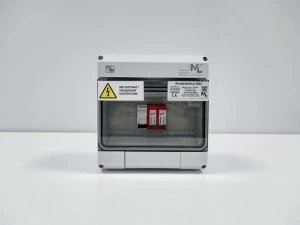 Rozdzielnica z ochroną przepięciową T2 oraz zabezpieczeniami nadprądowymi do stosowania wewnątrz i na zewnątrz pomieszczeń - odporność na UV.Wyprowadzenia przewodów realizowane przez złączki listwowe.Zabezpieczenie nadprądowe Schneider K60N-B16-1 - zalecane do falowników jednofazowych do 3,5kW. Maksymalny rozmiar obsługiwanych przewodów: 6mm2.