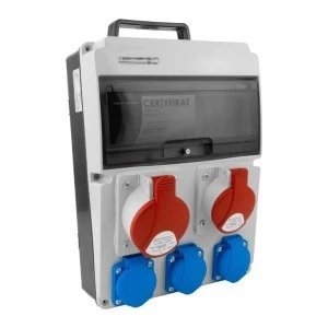 Rozdzielnica DV-8102-F oferuje wszechstronność dzięki wyposażeniu w gniazda jednofazowe z bolcem ochronnym oraz trójfazowe CEE. Umożliwia to bezpieczne i wygodne podłączenie różnorodnych urządzeń elektrycznych o napięciu 230/400 V i prądzie znamionowym 64 A. Taka konfiguracja sprawia, że produkt jest uniwersalnym rozwiązaniem dla różnych instalacji.