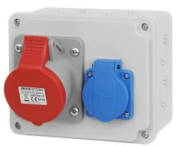 Gniazda jednofazowe 230V, posiadają klapki, dzięki czemu ich szczelność jest na poziomie IP54.