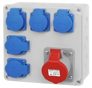 Gniazda jednofazowe 230V, posiadają klapki, dzięki czemu ich szczelność jest na poziomie IP54.