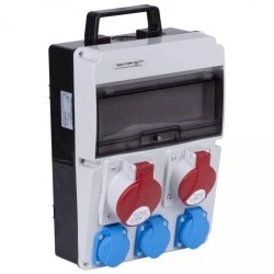 - Posiada trzy gniazda 230 V 16 A, 2 gniazda siłowe 400 V 32 A oraz 400 V 16 A