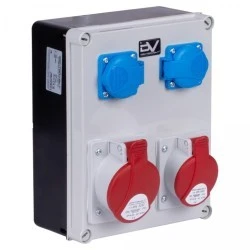- Wyposażona w cztery gniazda: dwa gniazda 230V 16A z bolcem ochronnym oraz dwa gniazda siłowe - 16A 400V oraz 32A 400V