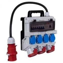 - Posiada cztery gniazda 230 V 16 A oraz gniazdo siłowe 400 V 32 A, 2x 400 V 16 A,