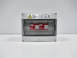 Rozdzielnica z ochroną przepięciową T1+T2 zabezpieczająca dwa MPP Trackery falownika z dwoma ogranicznikami przepięć (do max 4 stringów) do stosowania wewnątrz pomieszczeń. Wyprowadzenia przewodów realizowane przez sprężynowe złączki listwowe Phoenix Contact PT6 Twin (z opcją zrównoleglenia wewnątrz obudowy).
