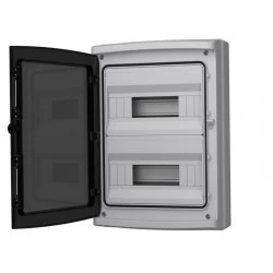 Rozdzielnica natynkowa 24 modułowa Marlanvil zastosowanie montaż zabezpieczeń nadmiarowo-prądowych, wyłączników różnicowo-prądowych oraz innych aparatów elektrycznych wymiary (l x h x p) A: 290 mm B: 420 mm C: 133 mm ilość modułów 12 (2x12) ilość rzędów 2 (12+12) montaż natynkowy stosowane do napięcia Uni 1000V DC Uni 1000V Unr 230 / 400V In 100A listwa zaciskowa N PE do zakupienia osobno (symbol 1006.12) dozwolona temperatura pracy od -25°C do +60°C odporność na uderzenia IK07 odporność na środki chemiczne i warunki pogdodowe tak stopień ochrony IP65 klasa ochrony II materiał obudowy technopolimer materiał drzwi poliwęglan kolor obudowy szary RAL 7035 kolor drzwi przyciemniane transparentne materiał śrub stal nierdzewna materiał uszczelki guma EPDM możliwość montażu za pomocą uchwytów dostępnych na naszych aukcjach pod symbolem 1.940.ST tak szyna DIN (TH/TS 35) do montażu aparatury modułowej tak etykieta samoprzylepna do opisu aparatury modułowej tak możliwość montażu zamka metalowego do rozdzielnic IP65 serii HIGHT Marlanvil hermetycznych 1000.SRHU tak bezhalogenowa tak normy/ dyrektywy CE Eu 2002/95/EC RoHS Deca-BDE CEI 23-48 producent Marlanvil symbol 940.24.1 kod EAN 8017521091457