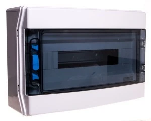 Jednorzędowa rozdzielnica modułowa o szerokości 18 modułów, przeznaczona do montażu natynkowego w instalacjach elektrycznych wymagających ochrony przed kurzem i strumieniem wody (IP65) oraz odporności na promieniowanie UV.