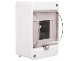 Obudowa natynkowa pod aparature modułową, z miejscem na cztery moduły (1x4S) oraz możliwością umieszczenia dwóch plomb po przekątnych rogach obudowy, wykonana z tworzywa ABS charakteryzującego się wysoką odpornością mechaniczną, w kolorze białym, ze stopniem ochrony IP40 i z samoblokującą się klapką otwieraną do góry, przystosowaną do plombowania w kolorze transparentnym - dymnym, z zaciskami N+PE. Obudowa jest testowana i certyfikowana zgodnie z normą PN-EN 62208:2011.
