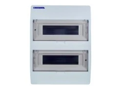 Obudowa natynkowa pod aparature modułową, dwurzędowa z miejscem na 24 moduły(2x12) przystosowana do plombowania, wykonana z tworzywa ABS charakteryzującego się wysoką odpornością mechaniczną, w kolorze białym, ze stopniem ochrony IP40 oraz napięciu znamionowym izolacji 1000V DC, posiadająca samoblokującą klapkę ochronną - otwieraną do góry, w kolorze transparentnym - dymnym, z metalową szyną TH, którą można demontować, oraz kompletem listw zaciskowych N+PE. Obudowa jest testowana i certyfikowana zgodnie z normą PN-EN 62208:2011.