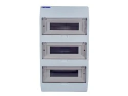 Obudowa natynkowa pod aparature modułową, trzyrzędowa z miejscem na 36 modułów(3x12) przystosowana do plombowania, wykonana z tworzywa ABS charakteryzującego się wysoką odpornością mechaniczną, w kolorze białym, ze stopniem ochrony IP40 oraz napięciu znamionowym izolacji 1000V DC, posiadająca samoblokującą klapkę ochronną - otwieraną do góry, w kolorze transparentnym - dymnym, z metalową szyną TH, którą można demontować, oraz kompletem listw zaciskowych N+PE. Obudowa jest testowana i certyfikowana zgodnie z normą PN-EN 62208:2011.