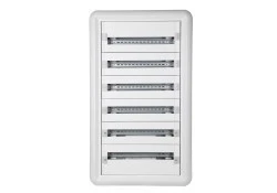 Modułowa rozdzielnica podtynkowa przeznaczona do instalacji elektrycznych w zabudowie ściennej; konstrukcja pozwala na montaż aparatów modułowych w układzie 6 rzędów po 24 moduły każdy, typ zastosowań obejmuje budynki mieszkalne, komercyjne i użyteczności publicznej.