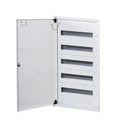 Rozdzielnica metalowa podtynkowa z szynami DIN; liczba modułów 5x18P; liczba rzędów: 5; prąd znamieniowy 63A; IP30; I klasa izolacji.