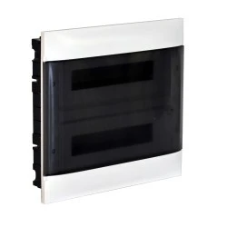 Rozdzielnica modułowa PRACTIBOX S 2x18 (137377) przeznaczona do montażu podtynkowego w zabudowie gipsowo?kartonowej oraz murowanej; służy do montażu aparatów modułowych w instalacjach elektrycznych budynków mieszkalnych i małych obiektów komercyjnych. Wyposażona w przezroczyste drzwi umożliwiające wizualną kontrolę stanu bez konieczności otwierania.