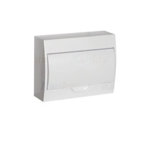Rozdzielnica natynkowa z listwami DIN 12 pól 1 rząd, napięcie znamionowe 230/400V AC; częstotliwość znamionowa 50Hz, prad znamionowy 63A; II klasa ochronności przed porażeniem elektrycznym; IP40, IK06; odporność temperaturowa 650°C; materiał: tworzywo sztuczne; kolor biały; drzwi białe.