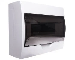 Rozdzielnica natynkowa z listwami DIN 12 pól 1 rząd, napięcie znamionowe 230/400V AC; częstotliwość znamionowa 50Hz, prad znamionowy 63A; II klasa ochronności przed porażeniem elektrycznym; IP40, IK06; odporność temperaturowa 650°C; materiał: tworzywo sztuczne; kolor biały; drzwi transparentne szare.