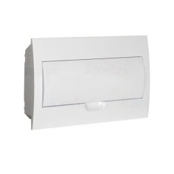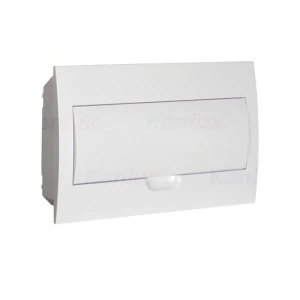 Rozdzielnica podtynkowa z listwami DIN 18 pól 1 rząd, napięcie znamionowe 230/400V AC; częstotliwość znamionowa 50Hz, prad znamionowy 63A; II klasa ochronności przed porażeniem elektrycznym; IP40, IK06; odporność temperaturowa 650°C; materiał: tworzywo sztuczne; kolor biały; drzwi białe.
