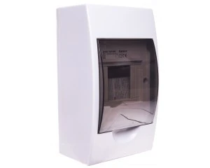 Rozdzielnica natynkowa z listwami DIN 4 pola 1 rząd, napięcie znamionowe 230/400V AC; częstotliwość znamionowa 50Hz, prad znamionowy 50A; II klasa ochronności przed porażeniem elektrycznym; IP40, IK06; odporność temperaturowa 650°C; materiał: tworzywo sztuczne; kolor biały; drzwi transparentne szare.