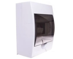 Rozdzielnica natynkowa z listwami DIN 6 pól 1 rząd, napięcie znamionowe 230/400V AC; częstotliwość znamionowa 50Hz, prad znamionowy 63A; II klasa ochronności przed porażeniem elektrycznym; IP40, IK06; odporność temperaturowa 650°C; materiał: tworzywo sztuczne; kolor biały; drzwi transparentne szare.