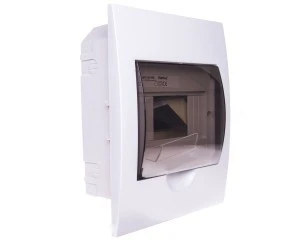 Rozdzielnica podtynkowa z listwami DIN 6 pola 1 rząd, napięcie znamionowe 230/400V AC; częstotliwość znamionowa 50Hz, prad znamionowy 63A; II klasa ochronności przed porażeniem elektrycznym; IP40, IK06; odporność temperaturowa 650°C; materiał: tworzywo sztuczne; kolor biały; drzwi transparentne szare.