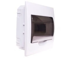Rozdzielnica podtynkowa z listwami DIN 8 pól 1 rząd, napięcie znamionowe 230/400V AC; częstotliwość znamionowa 50Hz, prad znamionowy 63A; II klasa ochronności przed porażeniem elektrycznym; IP40, IK06; odporność temperaturowa 650°C; materiał: tworzywo sztuczne; kolor biały; drzwi transparentne szare.