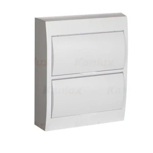 Rozdzielnica natynkowa z listwami DIN 12 pól 2 rzędy, napięcie znamionowe 230/400V AC; częstotliwość znamionowa 50Hz, prad znamionowy 63A; II klasa ochronności przed porażeniem elektrycznym; IP40, IK06; odporność temperaturowa 650°C; materiał: tworzywo sztuczne; kolor biały; drzwi białe.