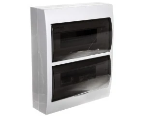 Rozdzielnica natynkowa z listwami DIN 12 pól 2 rzędy, napięcie znamionowe 230/400V AC; częstotliwość znamionowa 50Hz, prad znamionowy 63A; II klasa ochronności przed porażeniem elektrycznym; IP40, IK06; odporność temperaturowa 650°C; materiał: tworzywo sztuczne; kolor biały; drzwi transparentne szare.