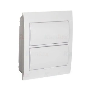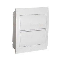 Rozdzielnica podtynkowa z listwami DIN 12 pól 2 rzędy, napięcie znamionowe 230/400V AC; częstotliwość znamionowa 50Hz, prad znamionowy 63A; II klasa ochronności przed porażeniem elektrycznym; IP40, IK06; odporność temperaturowa 650°C; materiał: tworzywo sztuczne; kolor biały; drzwi białe.