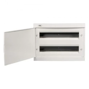 Rozdzielnica serii KDB, Długość [mm]: 426, Szerokość [mm]: 109, Wysokość [mm]: 310, Częstotliwość znamionowa [Hz]: 50, Klasa ochronności przed porażeniem elektrycznym: II, Kolor: biały, Kolor drzwi: biały, Liczba modułów: 2x18P, Materiał: tworzywo sztuczne, Miejsce montażu: do wbudowania w ścianę, Napięcie znamionowe [V]: 230/400 AC, Odporność temperaturowa [°C]: 650, Prąd znamionowy [A]: 63, Stopień IK: 07, Stopień IP: 30, Norma: PN-EN 62208, Liczba rzędów: 2, Ilość zacisków N/PE: (6+6+6)x2.