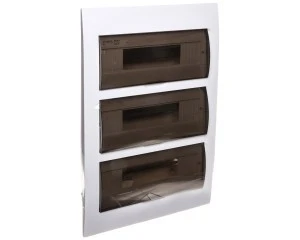 Rozdzielnica podtynkowa z listwami DIN 12 pól 3 rzędy, napięcie znamionowe 230/400V AC; częstotliwość znamionowa 50Hz, prad znamionowy 63A; II klasa ochronności przed porażeniem elektrycznym; IP40, IK06; odporność temperaturowa 650°C; materiał: tworzywo sztuczne; kolor biały; drzwi transparentne szare.