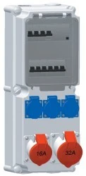 Rozdzielnica naścienna 3x16A 230V, 1xCEE 16A 5P 400V, 1xCEE 32A 5P 400V, 1x FI63/0,03A, 3xB16/1, 1xC16/3, 1xC32/3 IP44 519816