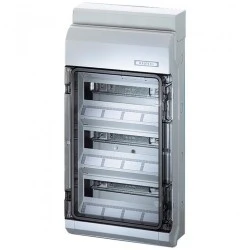 Rozdzielnica natynkowa hermetyczna HENSEL to solidna obudowa wyposażona w 12 modułów w 3 rzędach, zapewniająca ochronę w warunkach wewnętrznych i zewnętrznych dzięki stopniowi ochrony IP54.