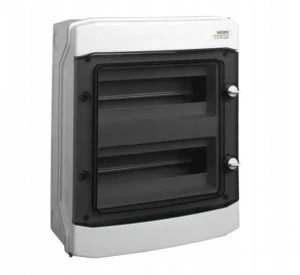 Rozdzielnica NOARK IP 65 1000V / 24p Kolor produktu: jasnoszary Liczba rzędów: 2 Szyna TH35 (DIN): 2x12 Zaciski PE/N: tak Rodzaj drzwi: przezroczyste przyciemniane Liczba drzwi: 1 Rodzaj zamka: zamek z tworzywa Możliwość plombowania: tak Rodzaj materiału: Akrylonitryl/styren/akrylan (ASA) bezhalogenowy Liczba modułów 18mm: 24 Prąd znamionowy In: 63 A Znamionowe napięcie izolacji Ui: 690V AC / 1000V DC Klasa ochronności przeciwporażeniowej: II Stopień ochrony: IP65 Odporność uderzeniowa: IK08 Odporność na promieniowanie UV: tak
