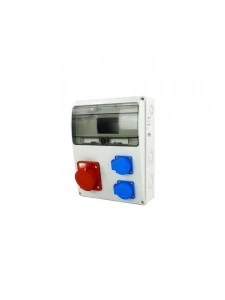 Rozdzielnica siłowa n/t 1x16A 5P 2x230V 11-mod. IP44 NBOX-11M.5 NEXT. Populatrny model RS w wersji natynkowej. Rozdzielnia siłowa NBOX-11M.5 wyposażona jest w gniazdo siłowe oraz gniazda zasilania. Oferowany w naszej hurtowni elektrycznej model posiada 1 gniazdo siłowe na 16A w wersji 5P. Gniazdo posiada czerwoną klapkę zabezpieczającą. Obok gniazda siłowego znajdują się 2 gniazda wtyczkowe na 230V. Ich klapki mają kolor niebieski. Otwierane są w bok. Powyżej gniazd, na froncie rozdzielnicy – znajduje się miejsce na montaż aparatury modułowej. RS 3605258 pomieści modułówkę zajmującą do 11 modułów, na szynie DIN (w komplecie). Oczywiście model ten jest wyposażony również w listwy zaciskowe N+PE. Modułówka zabezpieczona jest klapką transparentną z PC, przydymioną. Jest ona zamykana na klik.