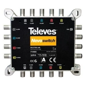 5-wejściowy rozgałęźnik NevoSwitch (jedno wejście naziemne i cztery polaryzacje satelitarne). Urządzenie stosowane do podziału odbieranego sygnału na dwie równe części. Straty przejściowe: 4dB (w paśmie naziemnym i satelitarnym).