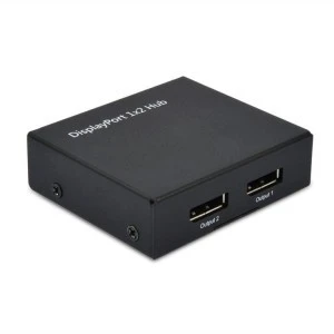 - Ten podwójny hub DisplayPort wysyła sygnały ze źródła DisplayPort do dwóch monitorów DisplayPort